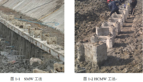 我公司科研人员根据市场需求,开发出增强型SMW(图1.0-1)工法:HCMW工法(水泥土预应力板桩工法)(图1.0-2)。