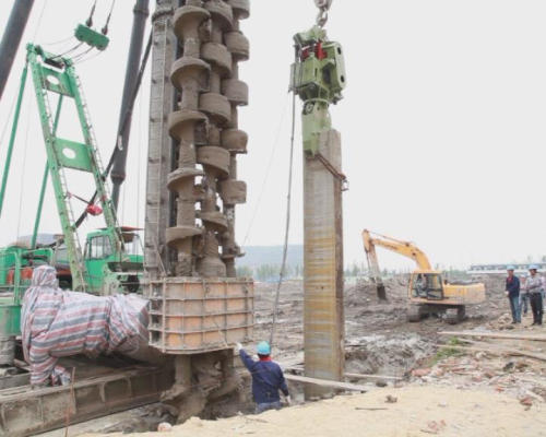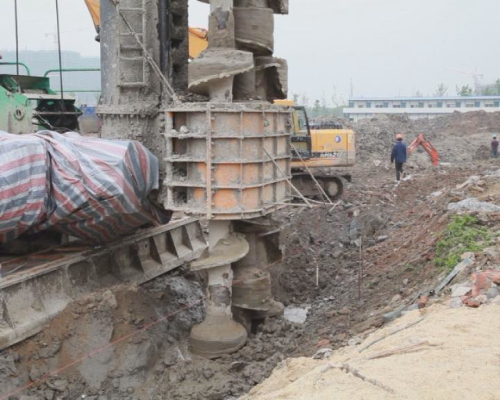 HCMW工法是利用多轴式长螺旋钻孔机在土壤中钻孔达到预定深度后,边提钻边从钻头端部注入适合工程要求的水泥浆,并与原土壤进行搅拌。它是采用专用钻机,用水泥作为固化剂与地基土进行原位的强制性搅拌,并插入预制预应力钢筋混凝土板桩,固化后形成水泥土“地下连续墙”墙体,充分利用水泥土挡土墙的高止水性及预制预应力钢筋混凝土板桩具有的强度,通过二者的复合作用,用作基坑挡土和侧向防水结构。