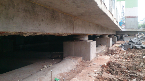 1.夏季炎热条件下浇筑混凝土时,如与混凝土接触的物体高温而干燥,则浇筑在该处混凝土中的水泥水化特别快,混凝土中的水分被吸收将不易彻底硬化。因此,项目部在浇筑基础增大部分的混凝土时,对原基础凿毛清理后进行洒水充分降温润湿,可避免温度升高和干燥。