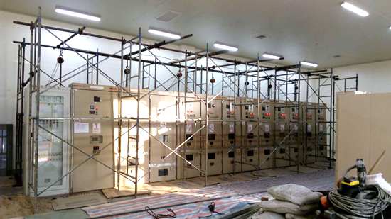 注浆施工完成后需要对一组倾斜的高压电柜进行校正,通过甲方联系供电部门,在元旦进行断电处理,保证校正时不发生安全事故,同时采用七个手动葫芦对电柜进行提升,保证电柜内铜棒等原件不受损伤。
