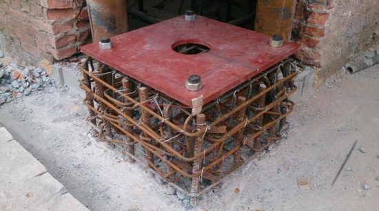 绑扎下支墩钢筋、放置隔震垫下预埋板