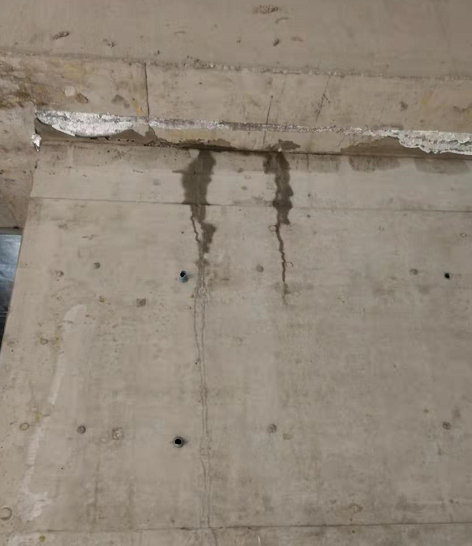 第一类,毛细空隙:人眼看上去剪力墙与梁紧密接触,通过顶板预留透气孔渗水从剪力墙顶端渗出,推断剪力墙与水平构件之间依然存在缝隙