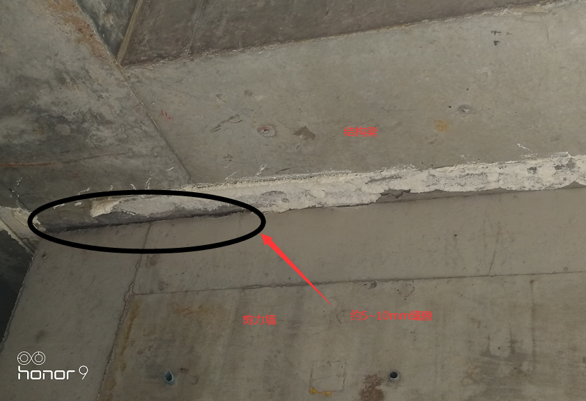 第二类,细微缝隙:此种情况为剪力墙顶部与结构梁之间存在几毫米~10mm。