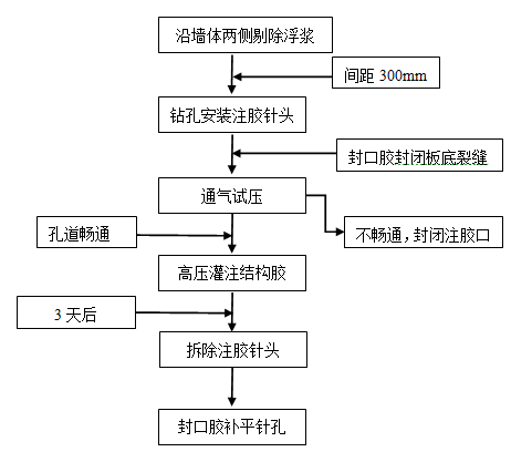针对类似于第一类、第二类的几毫米的小型缝隙,采用高压注入结构灌缝胶(灌缝胶抗压强度≥65Mpa)的方式施工,注胶施工采用高压灌注堵漏机高压灌注。