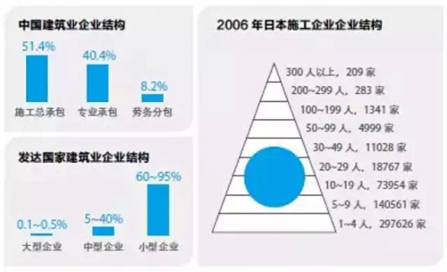 从国际上看,建筑业早已呈现规模经济的基本规律,这样就形成了大企业数量很少,专业分包众多的良性产业生态,日本、欧美无不如此。
