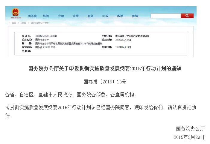 4月14日,国务院办公厅印发《贯彻实施质量发展纲要2015年行动计划》,对今年贯彻落实《质量发展纲要(2011—2020年)》的工作重点做出明确部署。