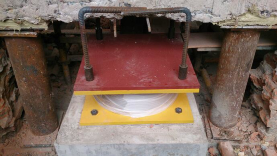 绑扎下支墩钢筋、放置隔震垫下预埋板