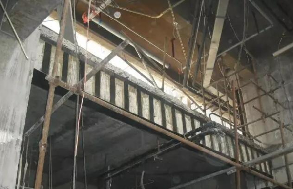 该法受力可靠、施工简便、现场工作量较小,可对构件进行有针对性地补强,且抗老化、抗疲劳性能好,常用于既不允许显著增大原构件截面尺寸,又要求大幅度提高承截能力的混凝土结构加固,如墙体、柱、梁、板等加固。但该法用钢量较大,且不宜在无防护的情况下用于600℃以上的高温场所。