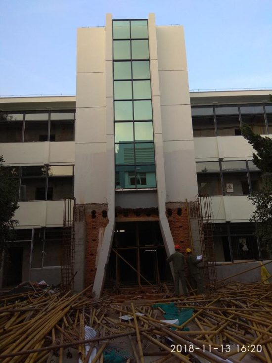 6#楼建于上个世纪90年代,砖混结构,现场观感质量较差。功能改造,需在原门头外延伸增加一层门头,原结构施工图采用凿除部分承重砖墙,在凿除墙体内新增混凝土框架梁柱,以承受上部墙体重量,施工难度及风险较大。