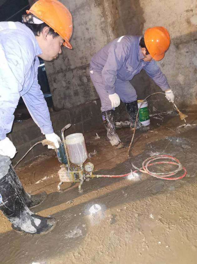 1、对其他渗漏部位进行临时性止水,根据现场情况选用聚氨酯、丙烯酸盐注浆材料进行高压注浆,确保后续施工界面干燥。