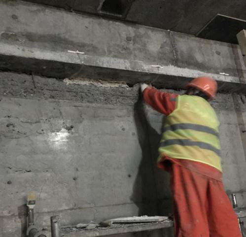 南京华润某项目,地上为二十层,地下设二层地下室,总建筑面积89820平方米。本工程地下室采用逆作法工艺施工,水平构件(结构梁、板)先施工,竖向构件(剪力墙、框架柱)再施工,浇筑完成拆模之后发现部分剪力墙顶部与结构梁、结构板之间存在空隙。