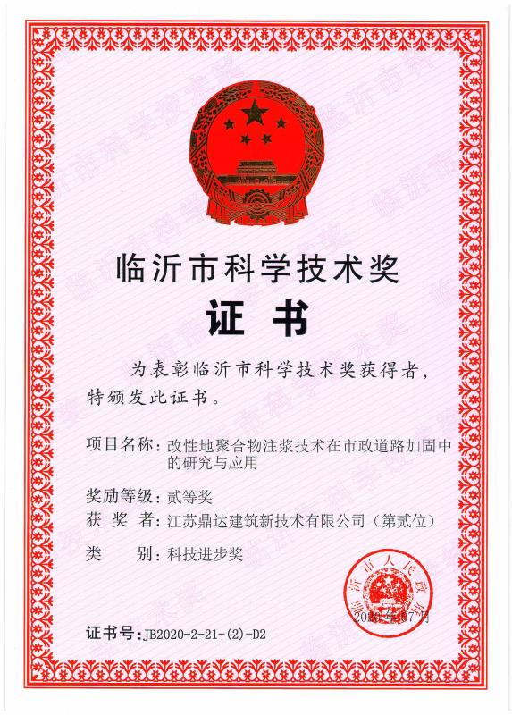近日,由临沂市人民政府公布的《2020年度临沂市科学技术奖拟授奖项目公示》中,我公司申报的《一种灌入式半柔路面的关键技术研究及改性地聚合物注浆技术在市政道路加固中的应用》(编号JB2-21)获得科技进步二等奖。