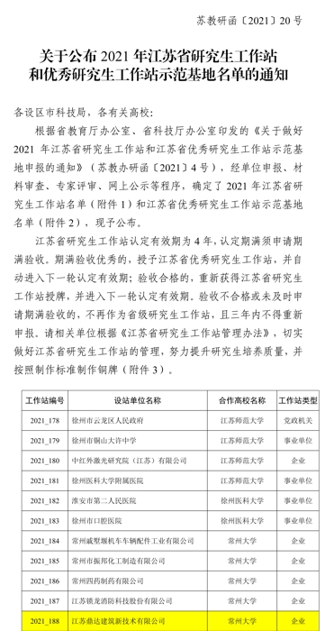 近日,江苏省教育厅、科技厅联合发布了《关于公布2021年江苏省研究生工作站和优秀研究生工作站示范基地名单的通知》,由我公司与常州大学共建的研究生工作站正式获批!
