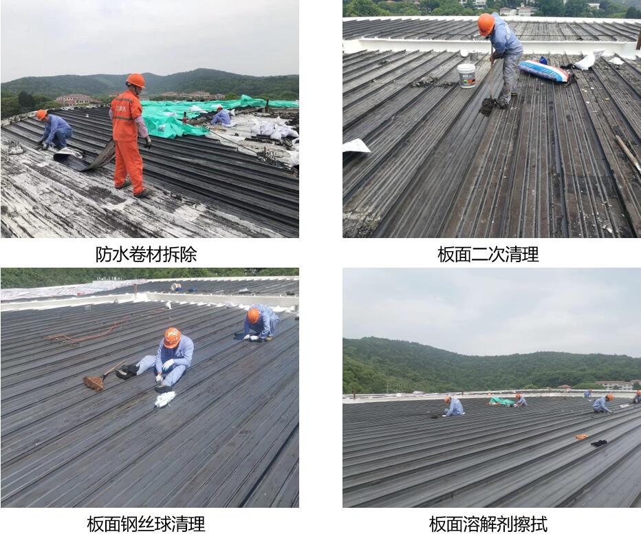 将屋面整体防水卷材进行清理、去除,屋面板表面附着的油膏等底涂采用钢丝球、溶解剂擦拭的方式进行清理,为后期防水施工做准备。