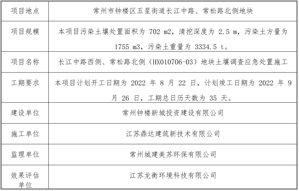 根据场地调查及风险评估结果,该地块部分区域土壤受到污染,且人体健康风险不可接受。为防止污染区域进一步扩大,尽快解决长江中路西侧地块内污染的环境隐患, 降低区域内环境风险,常州钟楼新城投资建设有限公司委托常州市恒卓建设工程管理咨询有限公司发布了“长江中路西侧、常松路北侧(HX010706-03)地块土壤调查应急处置施工”招标文件,对污染场地进行应急处置。我方中标后,编制了本方案,以期通过方案的实施消除该场地的环境风险,满足场地再次开发利用的质量要求。