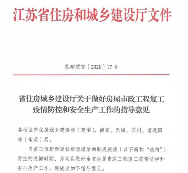近日江苏省住建厅发布《关于做好房屋市政工程复工疫情防控和安全生产工作的指导意见》,明确提出: